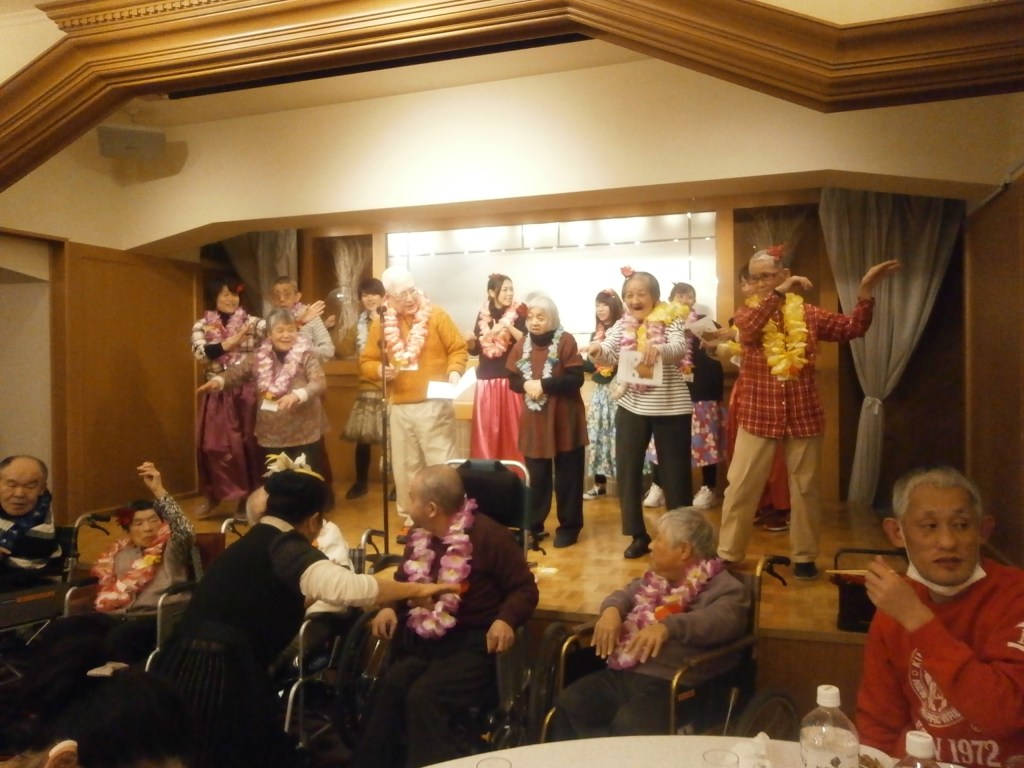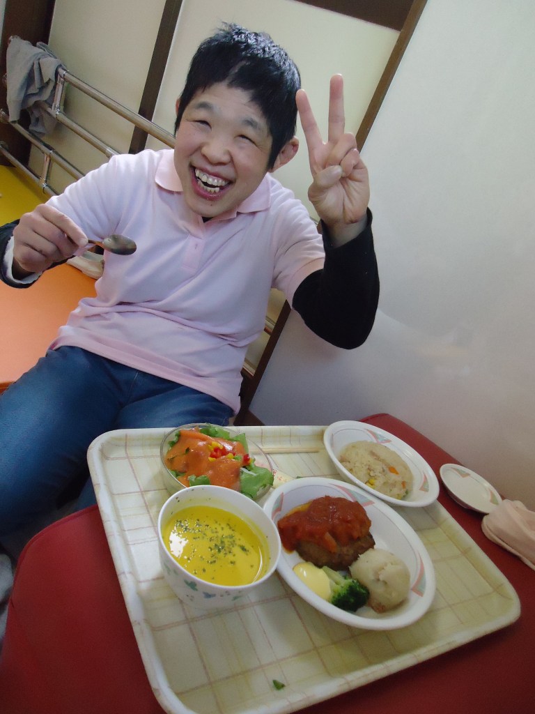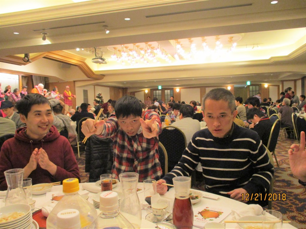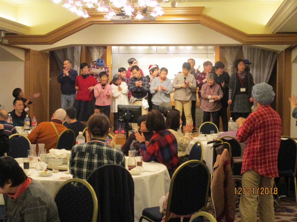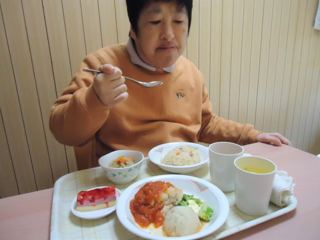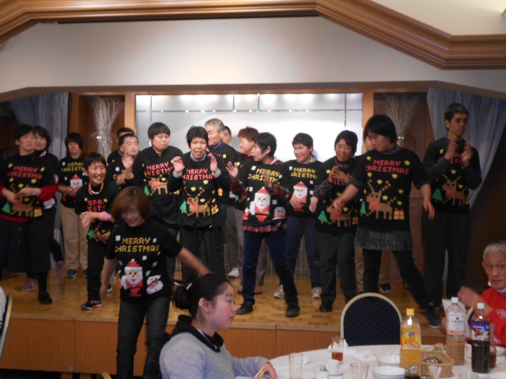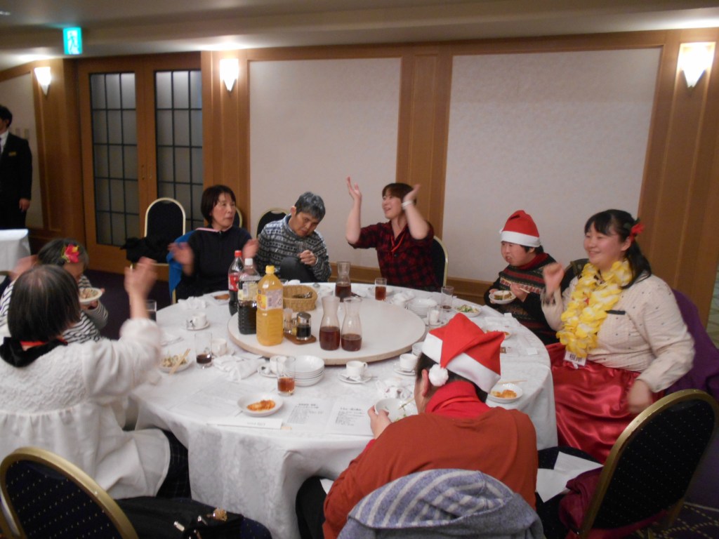 八王子エルシーでのクリスマス会です。バスや車以外に電車とバスを利用して会場に向かったグループもありました。学園に残った利用者もクリスマスメニューを楽しみました。
