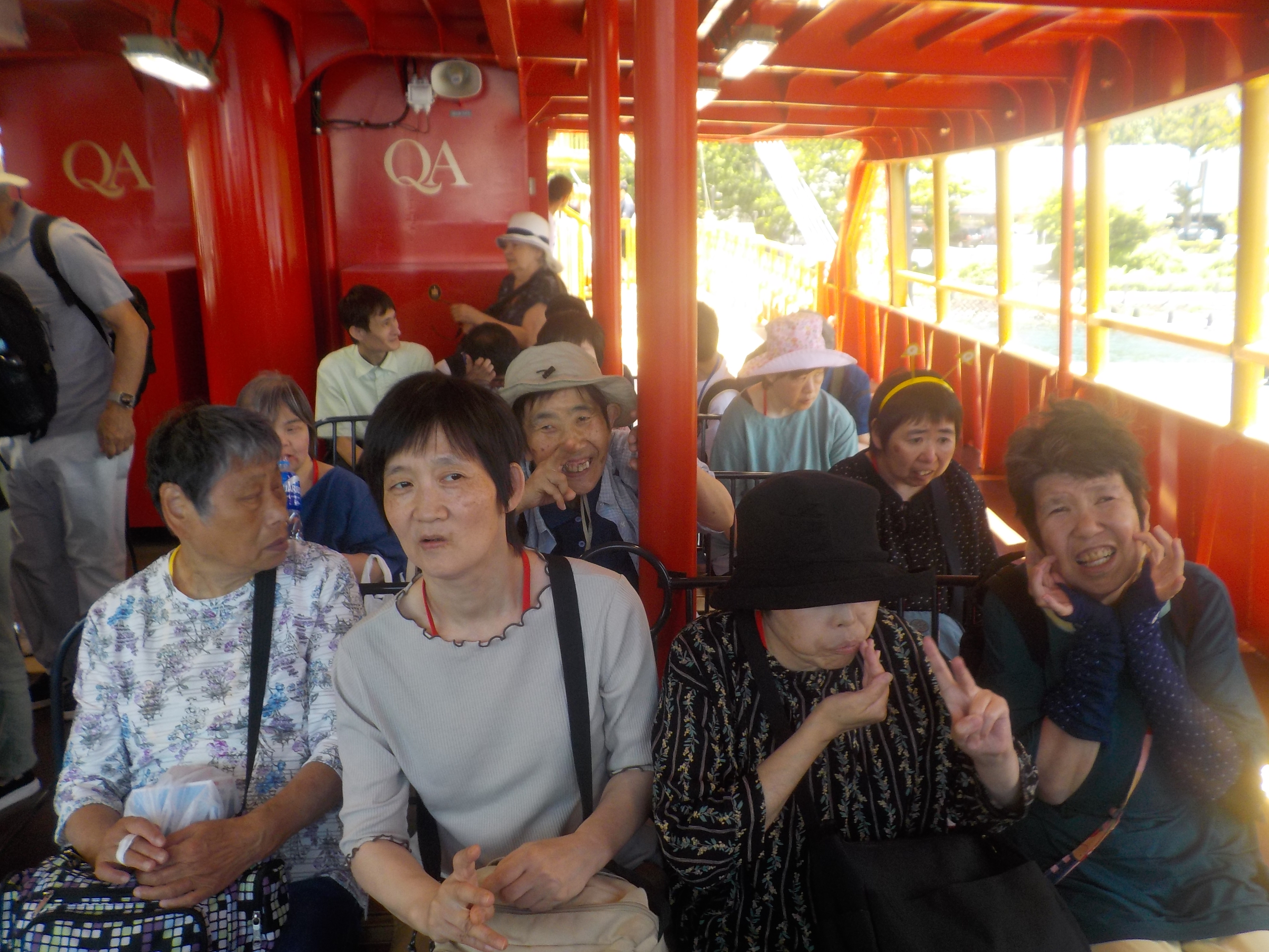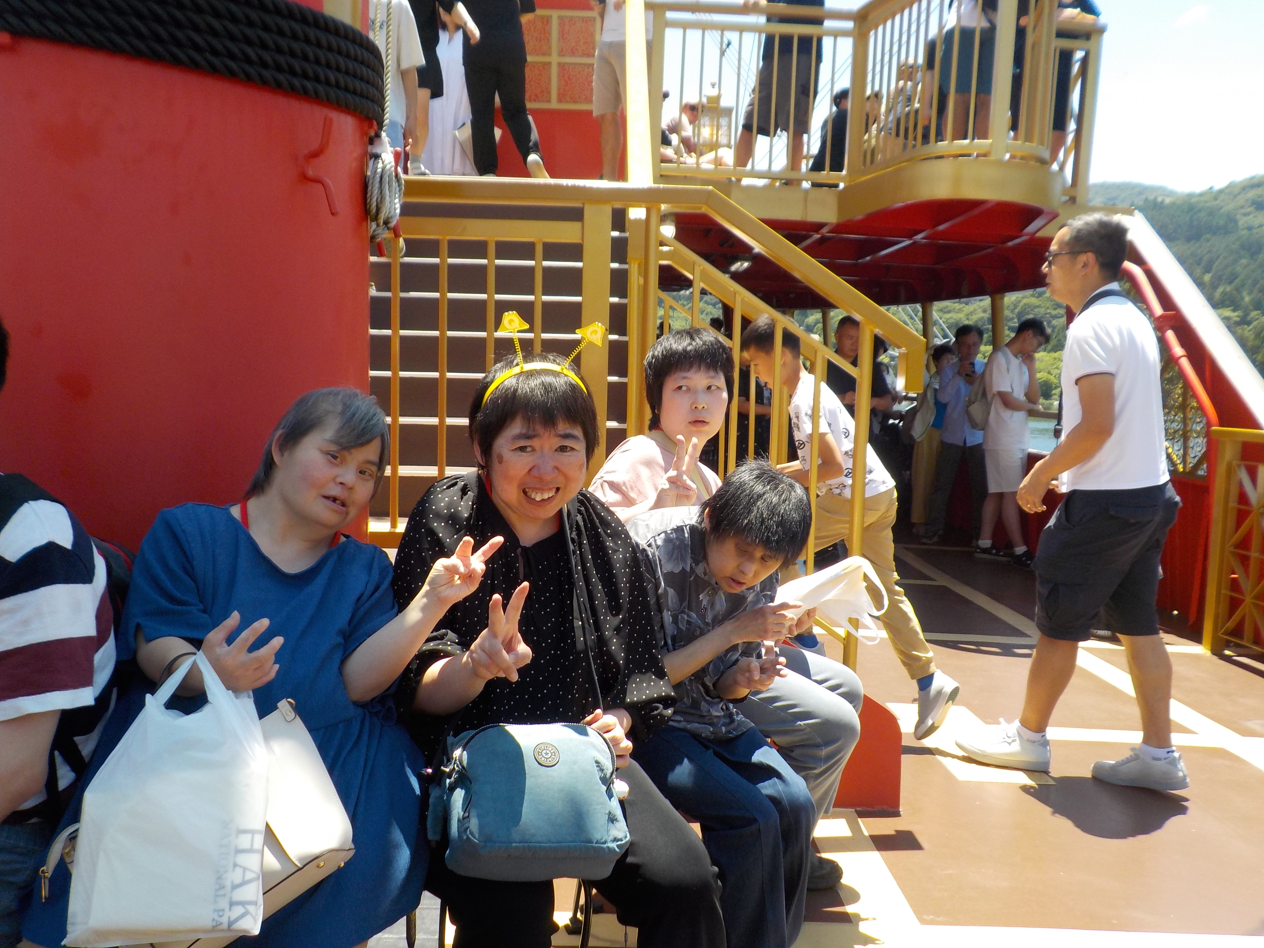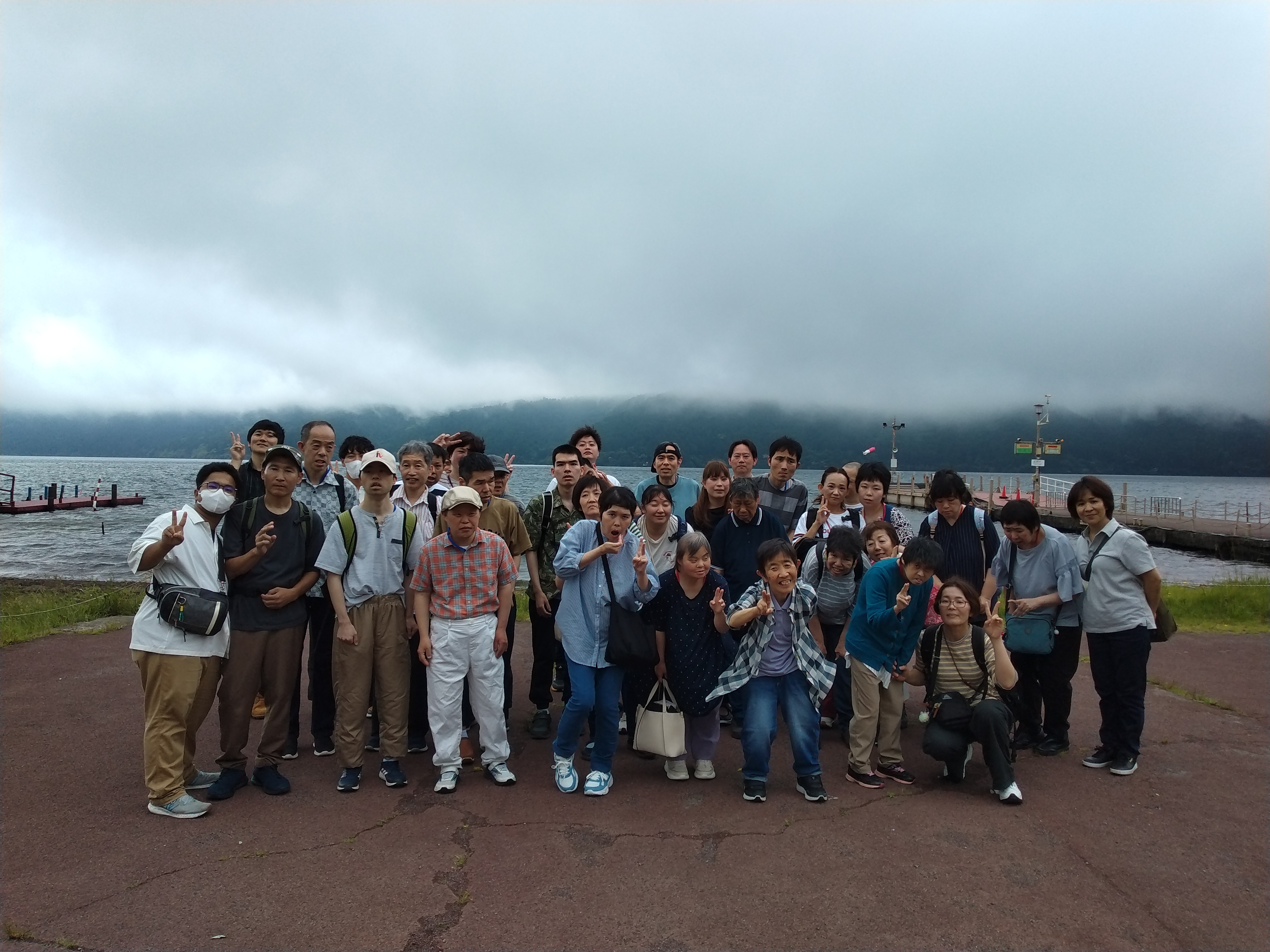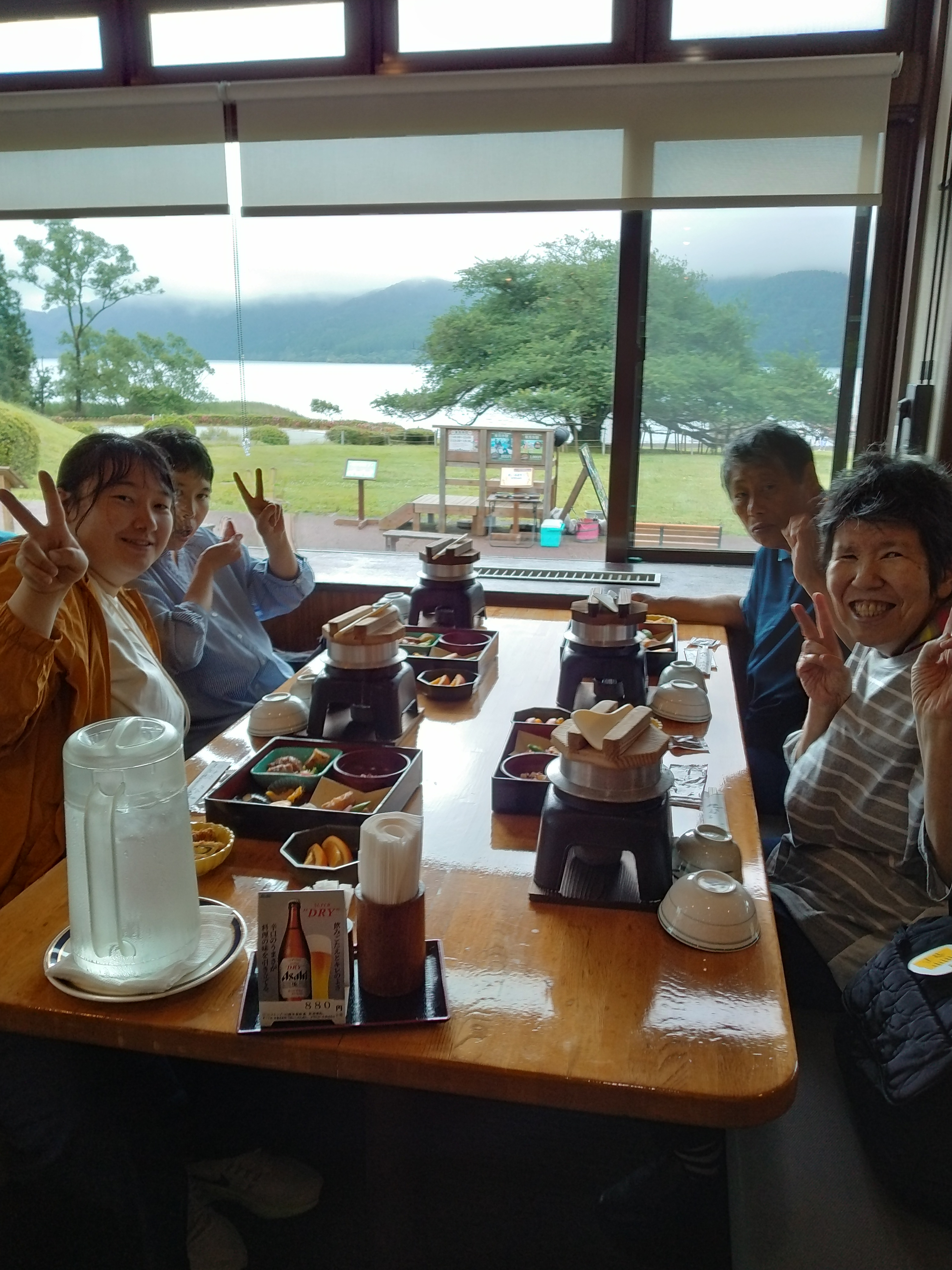 6月26日、27日に一泊旅行に行ってきました。当日は雨の予報もありましたが傘の必要はなく、翌日は天候にも恵まれました。一日目は箱根園を目指します。バスの中ではレクやカラオケを楽しみました。芦ノ湖で海賊船に乗る予定でしたが悪天候のため出航せず箱根園で昼食や買物を楽しみました。昼食は豪華な釜飯御膳でした!予定を変更し、道の駅伊豆ゲートウェイ函南へ。グループに分かれて買物や隣接の「めんたいパーク」で楽しみました。宿は伊豆長岡温泉のニュー八景島です。温泉風呂や宴会を楽しみました。宴会の最後には皆でマツケンサンバで盛り上がりました!朝は快晴で客室から富士山が見えました。朝食バイキングで好きな物を選び、大満足で宿を後にしました。二日目は一日目に乗れなかった海賊船に乗るために芦ノ湖へ。豪華な海賊船でゆったりと芦ノ湖を周りました。風に吹かれてとても気持ちが良かったです。昼食は御殿場高原ビール・グランテーブルへ。ハンバーグステーキとても美味しかったです。笑顔いっぱいで旅行を楽しみました。
